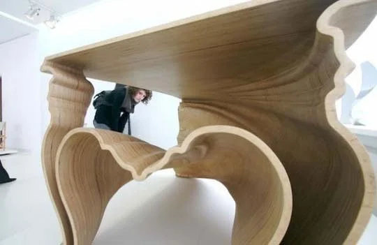 As its title implied, a workaday robot had been liberated into an aesthetic tool, like a humble servant brought to the ball. The table consists of 89 3d robot-cut layers of birch plywood, finished by hand.